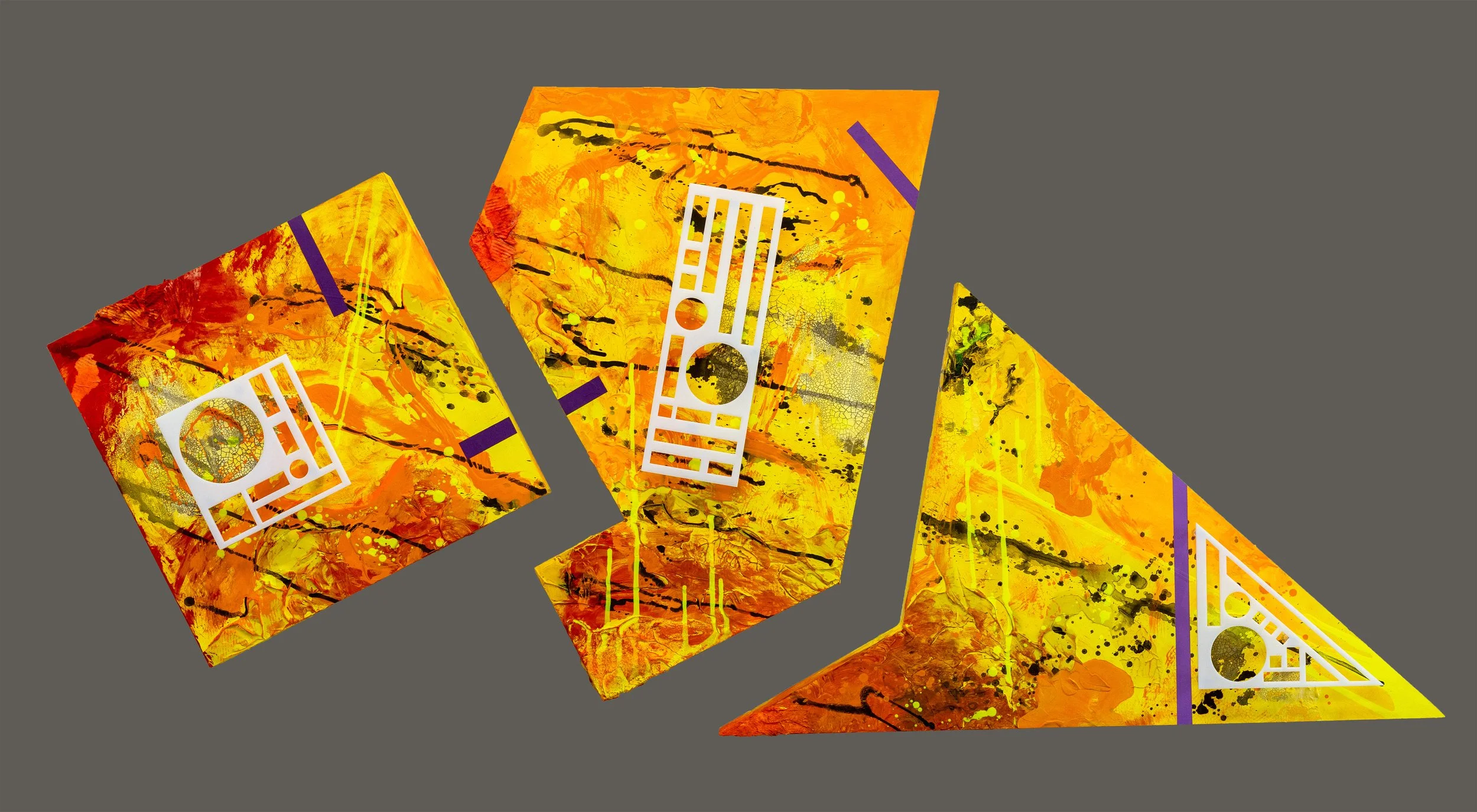 I accomplish this in two ways: first, by using white acrylic panels that have been laser cut to create perfect geometric-shaped holes, and second, by creating abstract expressionist paintings on panels that represent the chaos in our lives. The process of assembling the works is part of the experience. While building my work, it becomes apparent that even the acrylic panel is not perfect. The closer you look, the more the defects stand out.
